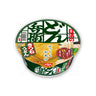 油揚げめん(小麦粉(国内製造)、植物油脂、食塩、植物性たん白、こんぶエキス、大豆食物繊維、糖類)、かやく(味付油揚げ、かまぼこ)、スープ(食塩、魚介調味料、粉末しょうゆ、魚粉(かつお、さば、いわし)、七味唐辛子、ねぎ、糖類、こんぶ粉末、こんぶ調味料)/加工でん粉、調味料(アミノ酸等)、増粘剤(アラビアガム)、炭酸Ca、リン酸塩(Na)、カラメル色素、香料、酸化防止剤(ビタミンE)、香辛料抽出物、乳化剤、パプリカ色素、クチナシ色素、ビタミンB2、チャ抽出物、ビタミンB1、ベニコウジ色素、(一部に小麦・乳成分・ごま・さば・大豆・ゼラチンを含む)